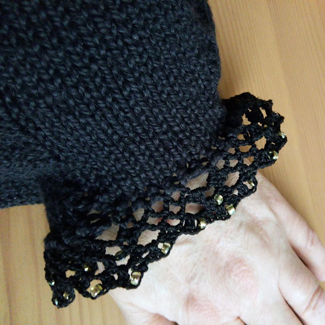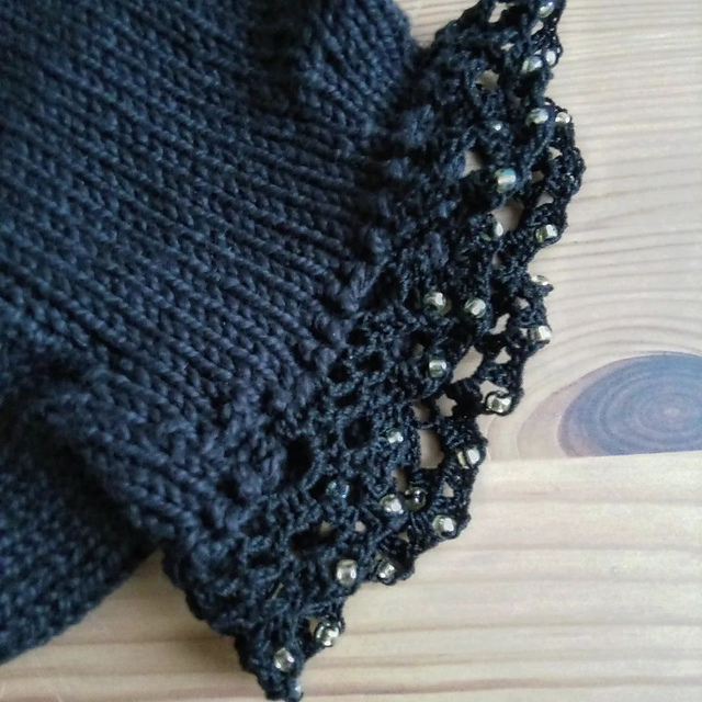 действительно, ощущение, что весна так никогда и не наступит... сегодня чуток получше. дети в школе, снег растаял. и хочется вязать что-нибудь весеннее (по хорошему, с моими темпами надо летнее, но так далеко я не заглядываю). я купила чОрные нитки FibraNatura Papyrus, собираюсь связать базовый свитер, или даже, возможно, водолазку. но хочется чем-то этот чОрный разбавить, но не цветом, чтобы он по-прежнему подходил ко всему. и вот что я придумала - для рукава (или подола, или кармана) - кружево тонкими нитками крючком с бисером. попробовала вчера, вроде нравится. только бисера должно быть не слишком много :) перевязывала даже сегодня утром :)