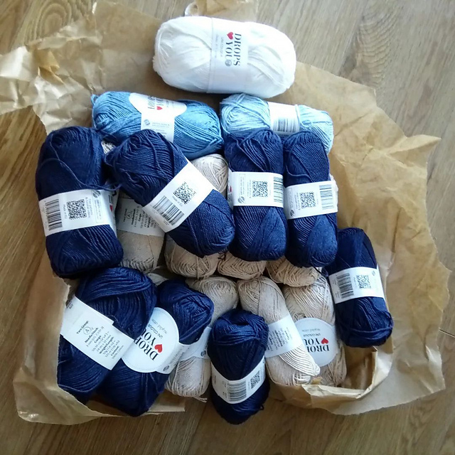вот у Дропс сейчас скидка на многие нитки - у самой фирмы. соответственно, магазинчики, которые у нас продают их продукцию, тоже разнообразные скидки делают. я купила такие недорогие ниточки из переработанного хлопка - хочу связать коврик на балкон, а, может, наволочку на подушку, а если ниток хватит, то и вязаный абажур замутить. идеи так и прут отовсюду :) коврик будет из бежевых и темно-синих ниток, а еще купила по одному моточку голубых, джинсовых и белых - вдруг понравится какое-нибудь другое сочетание...