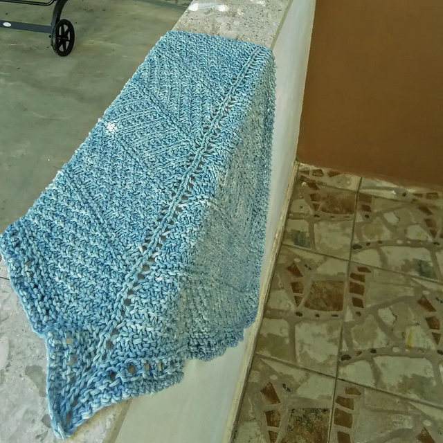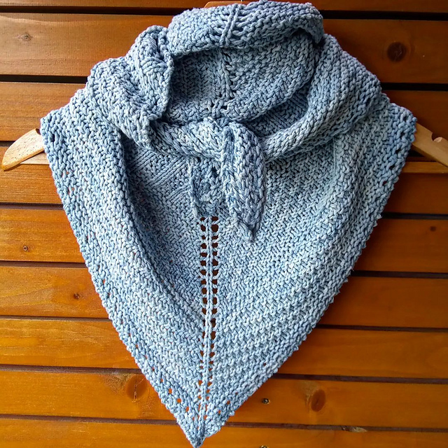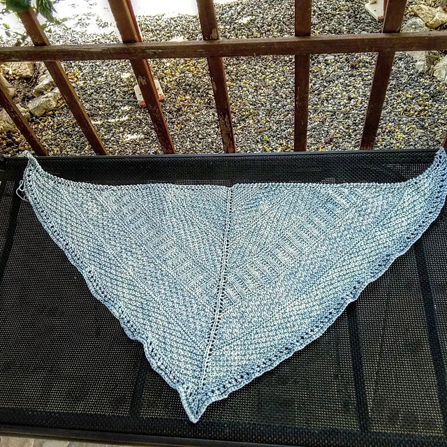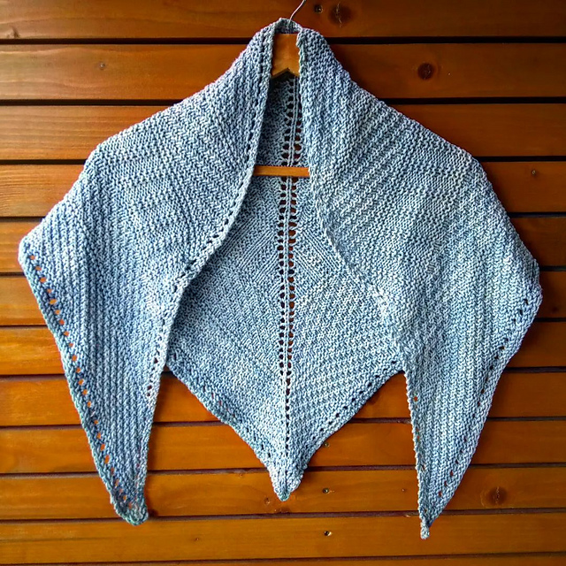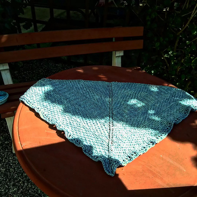 Небольшая треугольная шаль по мотивам паттерна Dustland от Стивена Веста, но его Dustland shawl полукруглая, а моя классическая треугольная от центра, предпоследний ряд связала, чередуя накиды и две вместе лицевой, так что получилась "решётка", гармонирующая с боковыми краями и центром. Полностью ушли две пасмы Scheepjes Skies heavy, цвет 100.