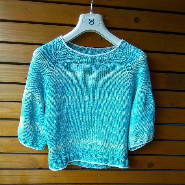 очень интересные нитки, чистый хлопок, меланж, купила "попробовать", придумала ЭТО, извязала все купленные 200 г. Нитки Scheepjes Softfun Aquarel, цвет Skyscape, ушло полностью 4 мотка по 50 г. Спицы 4,0 мм, вязка свободная, полотно мягкое, тянущееся. Реглан сверху по кругу. Лицевая гладь, отделка резинкой и айкордом белыми хлопковыми нитками. она задумана как "спортивная", очень простой крой. единственно, хотела сделать рукава "фонарики", но не очень получилось. надо было больше расширить, а я никти экономила :)