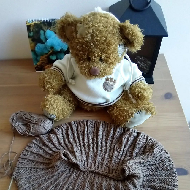 вязалась легко, увлечённо, а получилась слегка ни о чём. очень маленькая, скорее бактус. нитки эти покупались тоже на пробу, дорогие, всего две пасмочки, я вязала из них шапочку и коул, поносила, не понравилось, распустила.