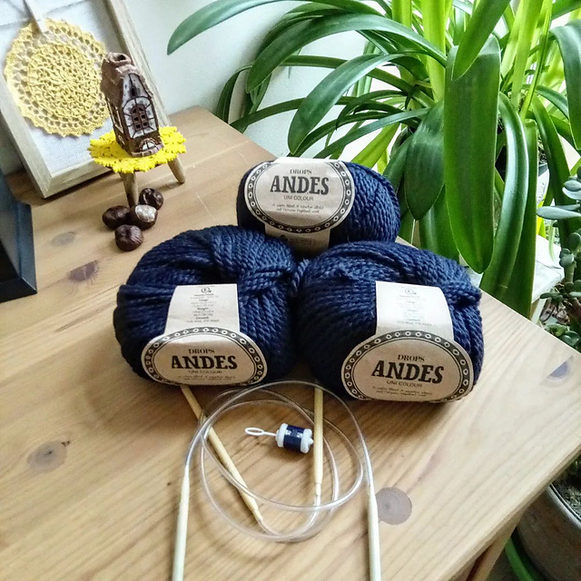 итак, Drops Andes, ушло почти 12 мотков по 100 г. , цвет 6990. Спицы 6,5 для лицевой глади, 5,5 для платочки. вязала по описанию, от себя добавила карманы, большие, глубокие. телефон в них просто тонет :)