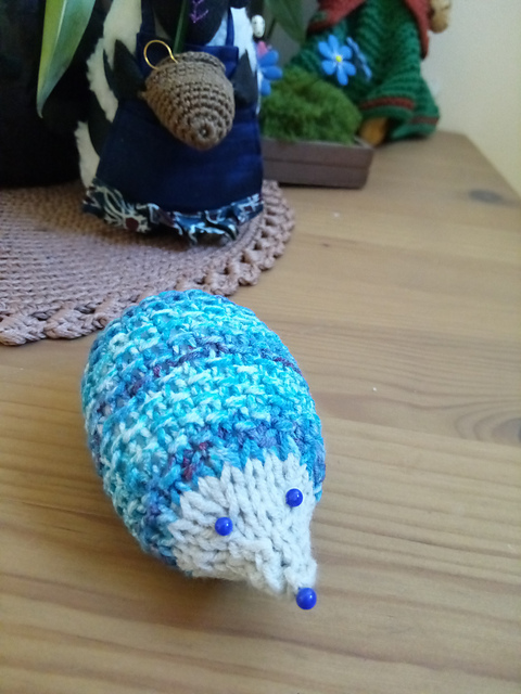 несколько мелочей: бандана/коул, косметичка-конверт из квадрата, три ёжика-игольницы, гетры, и - самое главное - носки! я научилась вязать носки. сначала связала, скорее, тапочки. потом что-то более похожее на носки, но, конечно, работать ещё есть над чем :)