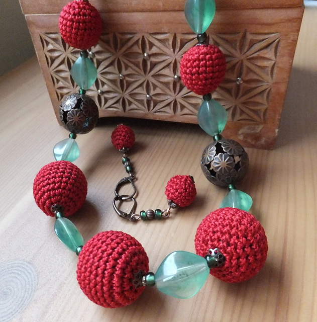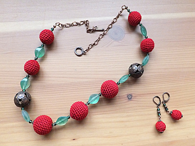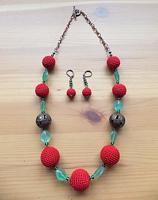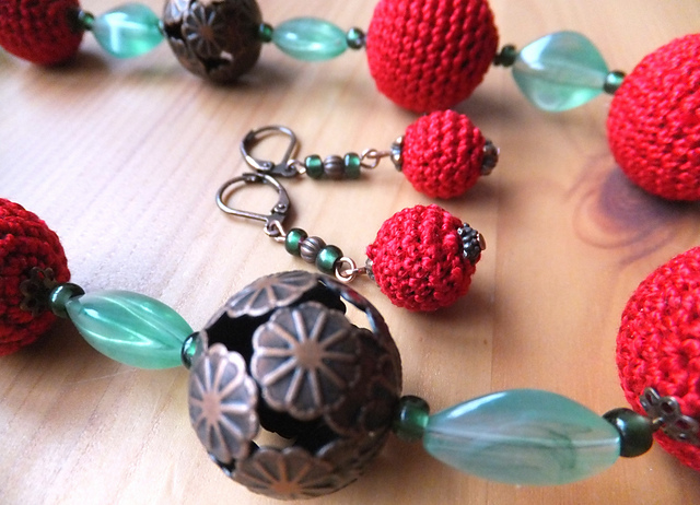 в последний день перед отпуском меня занесло в пряжный магазин, конкретного ничего не было нужно, просто мимо ехала (серьёзно!), но увидела ниточки YarnArt Lily, из которых частенько вяжу украшения, чудесного цвета красного вина, и не смогла устоять. стала потихоньку вязать шарики, а там и идея оформилась.