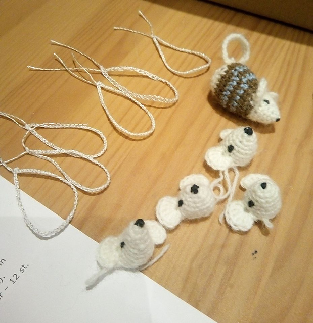 вообще год был "шальный", я связала 4 шали. а конец года - мышиный. нашла очень хорошее и простое описание Little Christmas Mouse, и по нему связала 15(!) мышей на мелкие подарочки.