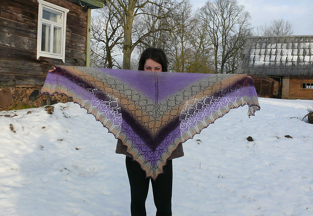 еще у меня остались красные Prestige - от шали Гейша и шапочки. неполный моток, и еще остаток, совсем немного, серо-черной секционки, из которой 2 года назад вязала свекрови палантин. и то и то - 100% шерсть. вот из них-то я и собралась вязать шаль на подарок. а модель выбрала вот какую: Лопи-лапушка.
