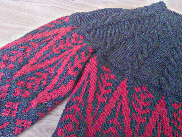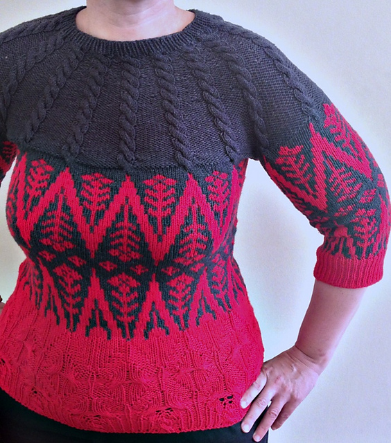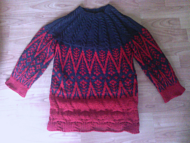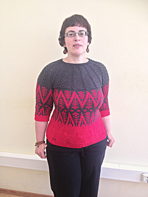 там всё отмечено. начала 23 марта, прерывалась, закончила 4 июня. использовала два паттерна, картинки из интернета, жаккардовый и араны с резинкой. в них одинаковое количество петель. жаккард финский вроде. кокетку расчитывала сама, прибавки делала, аж удивилась, как хорошо сидит. рукава сначала сделала такие же, темные с косами, но эти косы как стали извиваться по моей, с позволения сказать, мускулатуре... всё распустила и начала снова. могли бы быть подлиннее, но красные нитки закончились. жаккард вязала спицами 3,5 мм, остальное - 3 мм. для рукавов специально купила короткие на леске, очень удобно.