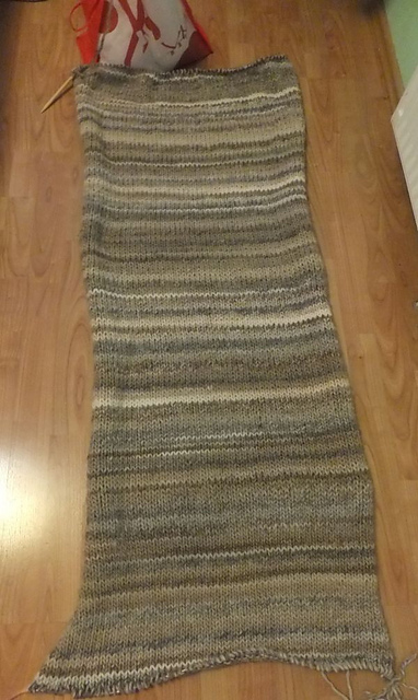 ёж решил утеплиться и начал вязать нечто огромное и безразмерное... что-то мне вдруг вчера втемяшилось, что надо побыстрее закрыть (извязав 5 мотков из 6), а из оставшегося довязать один рукав. сказано - сделано, весь вечер зашивала стороны, довязывала рукав, а как померила, поняла, что одну руку я вообще поднять не смогу. свитер планировался на работу для утепления в кабинете. как печатать буду???! всю ночь думала, и к утру надумала - распустить нахрен, довязать в длину, и просто сшить, как полагается, не добавляя ни рукава, ни резинки на низ, ни горловину. просто косо надетый сшитый кусок материала