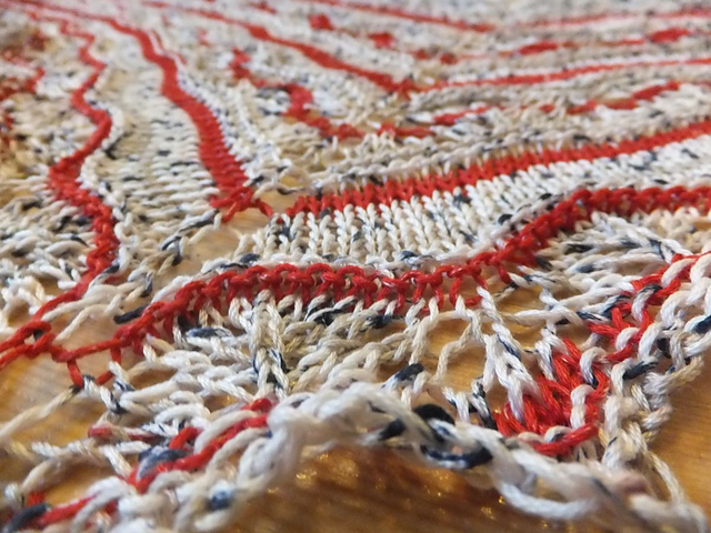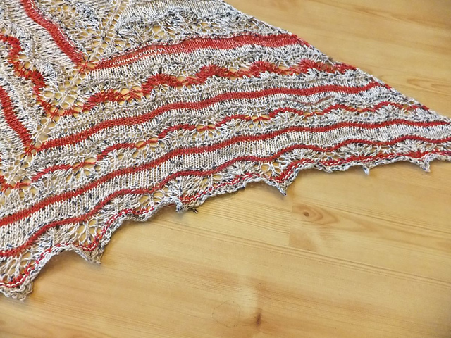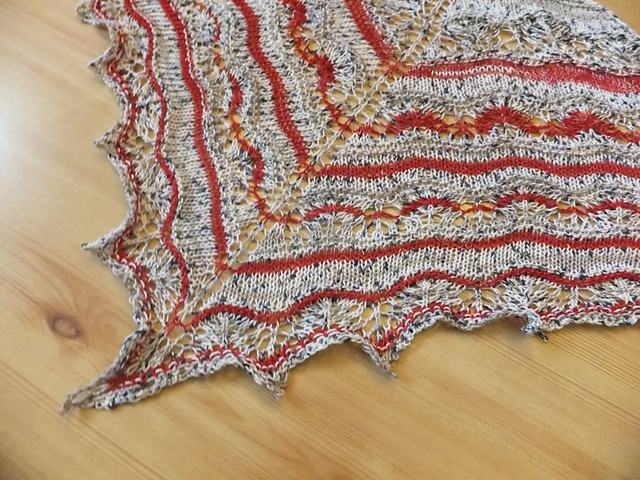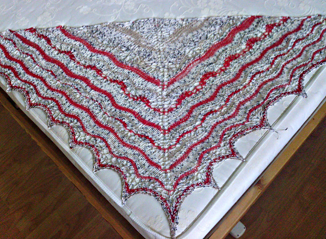 стирать и блокировать тоже было легко. но потом случилась неприятность. мне некогда было фотографировать в выходные (то хелловин, то день всех святых), класть в разложенном виде некуда, с кровати пришлось снять, спать же негде, чуть влажной. и я повесила её на стоящую гладильную доску. в результате она искривилась и вместо треугольника вышел ромб :((((((( снова блокировать сил нет, чес-слово... буду дарить так. а как хорошо выглядела на блокировке...