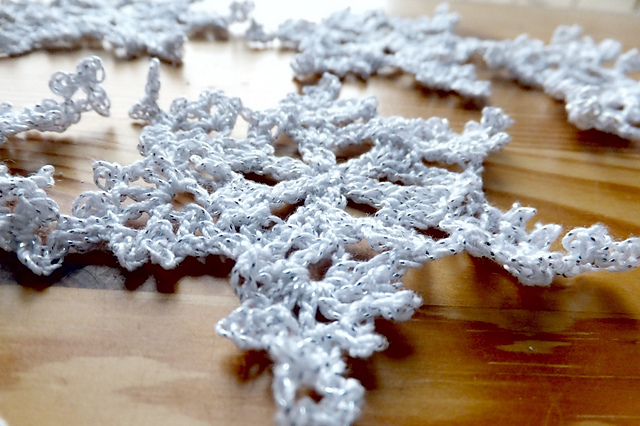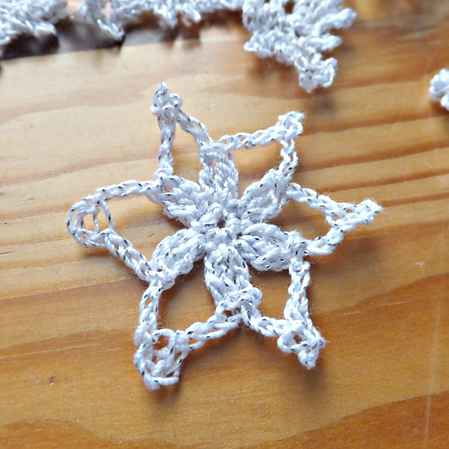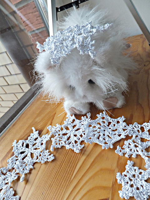 ТТХ: нитки Madame Tricote Paris Maxi Metallic, белые с серебрянным люрексом. крючок 2,5 мм.этими нитками-металлик хорошо вязать очень небольшие вещи, потому что они ужасно закручиваются. после каждой снежинки приходилось раскручивать. а так нормально. в снежинке всего 4 ряда, только я сразу не могла понять, где там что. но потом разобралась, стала раскручивать нитку и пошло живее. сделала еще несколько маленьких: две как серединка большой, две по другой схеме, но мне не очень понравилось...