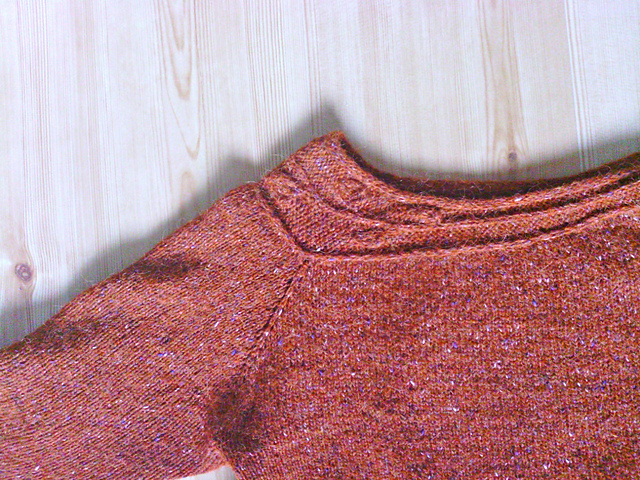 Модель: Sprig by Alana Dakos. паттерн достался мне на халяву пиратским образом - в конце прошлого года я рассорилась и разошлась с некоей вязальной группой, и в качество мелкой мести скачала их архив. чисто на всякий случай :))))) случайно его рассматривая, обнаружила там книгу Аланы Дакос "Botanical Knits", а в ней несколько прекрасных проектов. выбрала "Сприг", т.к. к этой пряже просилось что-то простенькое, но с изюминкой. изюминкой стали ворот и манжеты, которые вязались отдельно, но всё же не пришивались, а ввязывались в процессе закрытия.