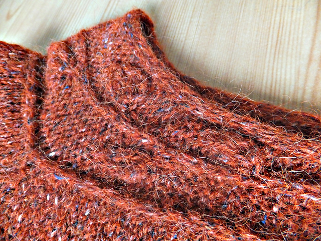что касается ТХ: спицы троечка, две пару круговых - длинная и короткая, и еще зачем-то купила чулочные, но они оказались не нужны :) а пряжа... ну, альпака, прекрасный цвет, фиолетовые "твидовые" пятнышки, мягенькая, приятная на ощупь, но... сыпется, зараза! даже после стирки от свитера - тут волосок, там волосок.... но теплая! несмотря на то, что ворот открытый и рукава короткие, свитер теплый очень оказался. ушло неполных 6 мотков по 50 г.