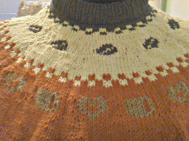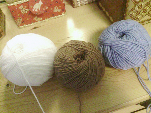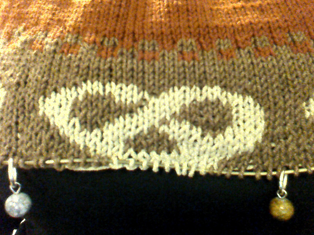 а теперь вопрос. дальше по моей идее предплагаются крУжки в области, извините, талии. большие, больше кренделей. на коричневом фоне. я застопорилась, какого цвета их делать? в наличии очень мало бежевого и рыжего, моток графитового и много коричневого. а ещё есть в запасе такие же нитки других цветов, оставшиеся от шапочки с баранами: белый и светло-голубой.