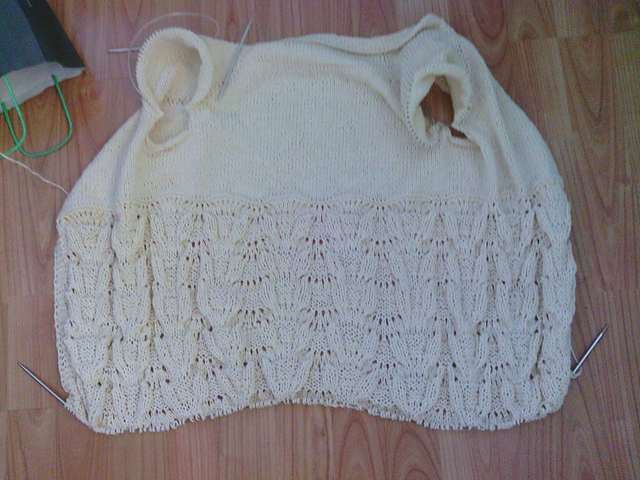 довязала туловище кофты. не стала делать длинной, надеюсь, восьми моточков хватит. посмотрела на сайте магазина - этого цвета у них только два осталось :) если что - докуплю. вот какой узор: