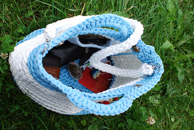 ТХ: сумка связана из веревок, которые наши рукодельные магазины специально продают для сумок. так что даже не уверена в составе :) купила два расфасованных по 100 метров мотка (не поворачивается язык назвать это пасмой), и у меня остался небольшой клубок белой верёвки. крючок 8 мм, донышко вязала по кругу, саму сумку тоже по кругу столбиками без накида, иногда переходя на соединительные. ручки вывязывались в процессе, длинная ручка - связанный крючком дуршнур. Хотя я выбирала веревки не самые толстые и без внутреннего наполнения (были и такие), сумка получилась тяжелёнькой. на килограмм потянет, а то и больше. пляжная из неё врядли получится. так, кинуть телефон и нетяжелый кошелёк и покрасоваться :) кстати, вязать было не тяжело, пальцы не болели, но я и не старалась вязать туго.