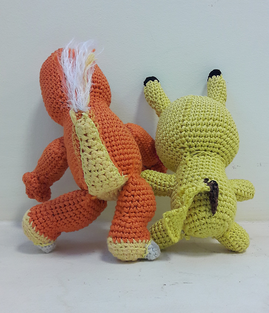 начат 30 октября, закончен ТОЛЬКО ВЯЗАТЬ 12 ноября, долго валялся в ожидании сборки, наконец Вера его набила, Саша сшил, я хвост перевязывала, бо коричневый должен быть, не черный, потом Верка с Илюшкой мордочку разрабатывали, мне рисовали, и я её связала из разных тонких ниток. а жёлтые - те же, что и для Чармандера, Camilla от Madame Tricote. крючок 4 мм. Вера регулировала также длину рук-ног.