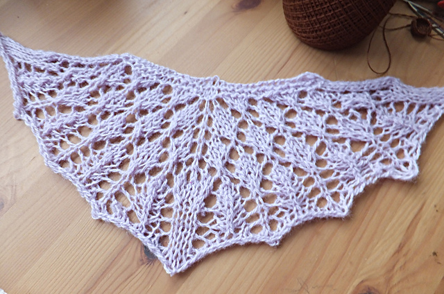 3. вяжу сейчас и уже заканчиваю (ура!) шаль June Bunnies. из сиреневой шерсти. т-т-т, идёт хорошо, легко, уже кайма пошла, авось заблокируется и понравится заказчице.