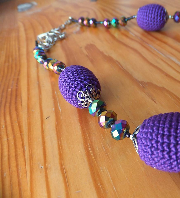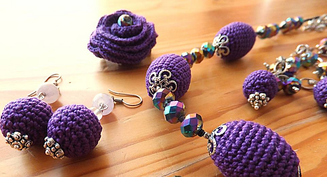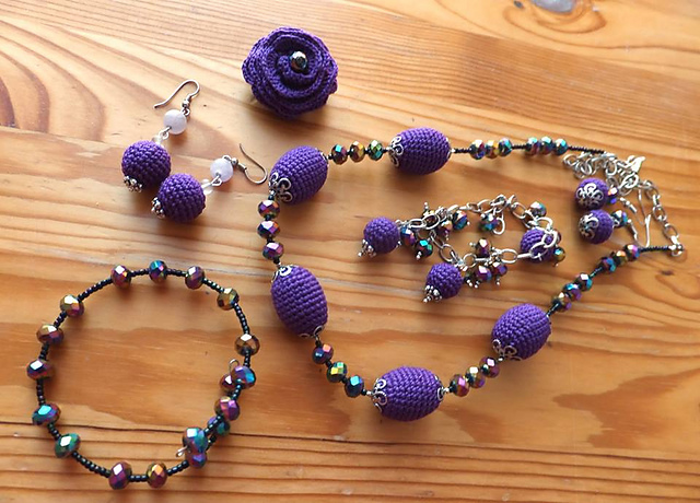 комплект 2 недели как связан, неделю как сфоткан :) красивый сочный фиолетовый цвет, который совершенно не даётся моему фотику :( уж я потом с настройками игралась-игралась... со стеклянными бусинами ("чешскими"???) с покрытием типа "aurora borealis". несколько лет назад что-то меня торкнуло купить нитку бусин, довольно дёшево. потом я их все нанизала на мемори-проволку и носила браслет, он ко всему подходил. потом надоел. а тут подумала, что с фиолетовым должно хорошо смотреться. бусин на всё хватило, и даже осталось :)