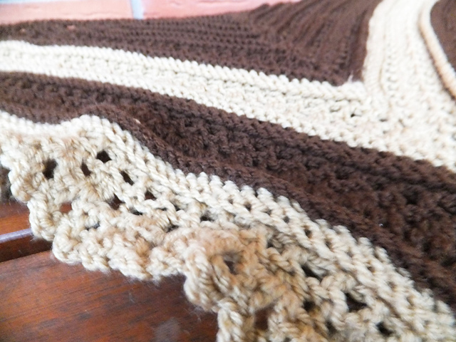 вязала неделю - со 2 по 9 января, причем последние три дня вязала последние два ряда :) нитки кончались, и я всё распускала и пробовала обыграть эти ряды по-новому. остался клубочек с полпальца. еще гипотенузу обвязала столбиками без накида, чтоб потвёрже была.