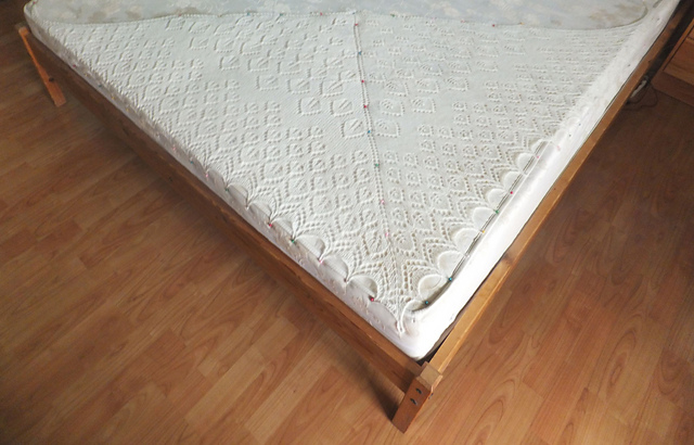 TTX: ушло, как и указано в описании, ~750 м - полтора мотка. нитками я довольна, не кусачие, мягкие, пушистые в меру. 50% мохера (то есть козья шерсть), 20% шерсть (овечья), 30% акрил. спицы 4 мм. вязалось легко и физически и морально :))) начала вязать 22 апреля, закончила (с перерывами) 12 мая. заблокировалась отлично. я побила свой собственный рекорд - самая большая моя шаль, по длинной стороне 210 м. мне не хватило ширины кровати, пришлось зубчики загнуть на бок матраса :)