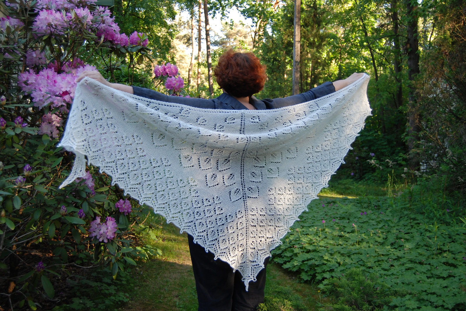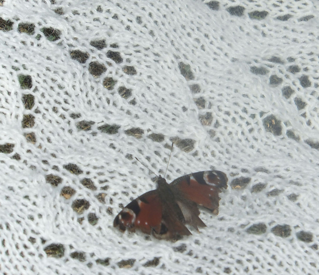 к сожалению, кроме бабочки, ничего хорошего не получилось. пришлось ждать вечера с его мягким светом и брать за шкирку фотографа :) спасибо за фото, что касается модели: я довольна. очень простая в исполнении, а выглядит эффектно! при вязании достаточно было посмотреть в начало ряда, и дальше шло как по маслу. одна проблема: в бесплатном описании давался весь рисунок половины шали целиком, и отпечатанный весь на листе А4 он был очень мелким, нифига не видно. обычно авторы рисуют начали, конец ряда и один повторяющийся раппорт, и показывают, сколько раз его нужно повторить. так я вырезала часть рисунка и увеличивала его. пришлось немного потрудиться :)))