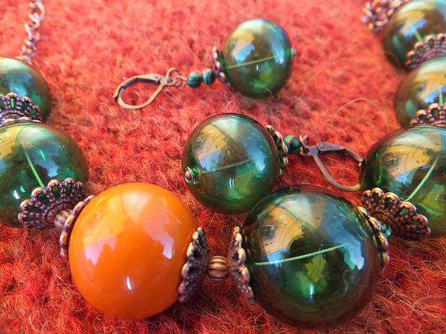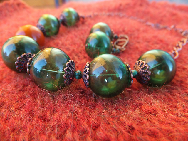 froggynord бусины лэмпворк - дутые зеленые и одну оранжевую. к кардигану - идеально :)