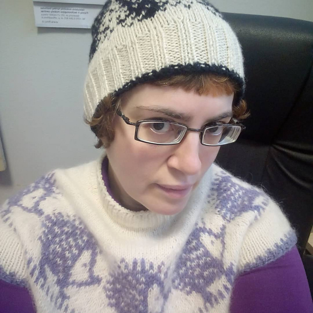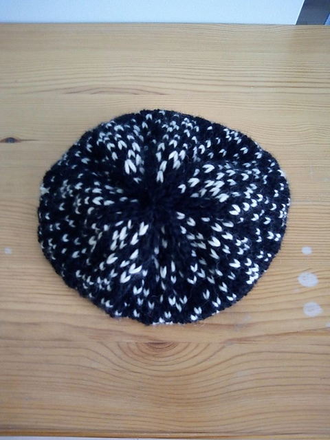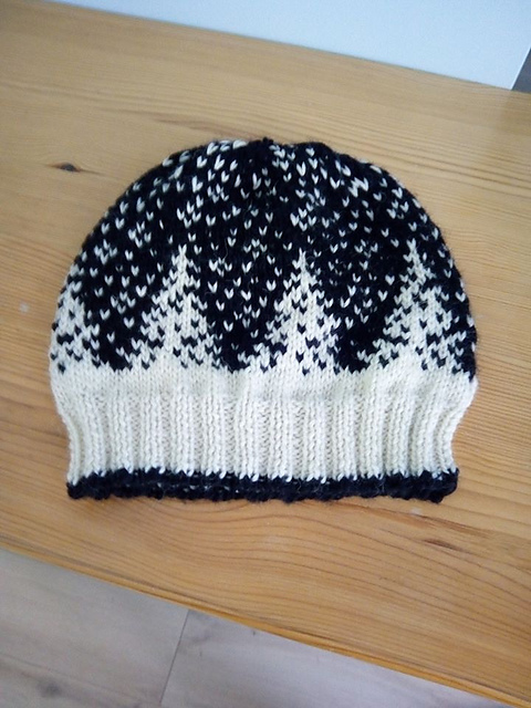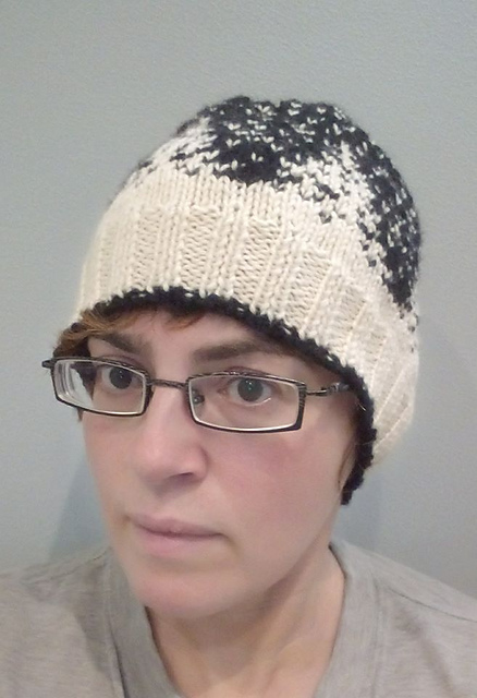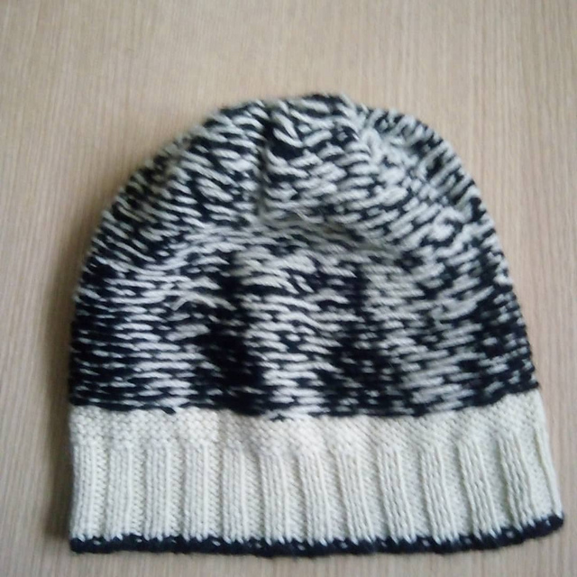 так что я сделала 7 раппортов, набрала 105 петель на спицы 4.0 черной нитью, перешла на спицы 3,25 и связала резинку 2х2 белой нитью 16 рядов. соединила в круг, перешла на спицы 4.0, связала 2 ряда белой нитью лицевой гладью. перешла на спицы 4.5, продолжила вязать по схеме. пропустила ряды 25-29, закончила по схеме, закрыла последние 14 петель иглой.