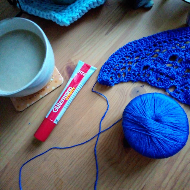 текстильный клей. вообще-то он предназначен склеивать куски материала, но вязальщицы приспособили под свои нужды :) как увидела рекламу на ФБ, сразу помчалась заказывать. ничего, работает! только мне как-т много его выдавливалось всё время :) надо наложить концы ниток друг на друга, капнуть клеем, прижать и подержать минут 10-15. правда, надо постараться именно чуть-чуть, потому что место склейки становится твёрдым. но не слишком мало, а то держать не будет. в общем, играюсь :) для не-шерсти просто необходим...