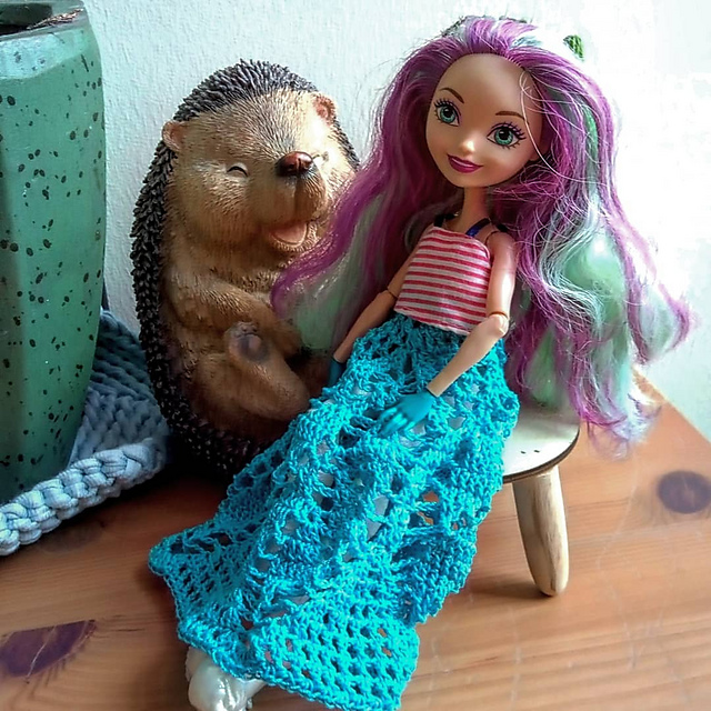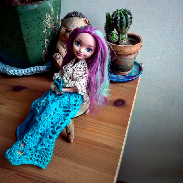 А вот эти две красавицы свои обновки получили раньше. Рейвен Квин - шерстяную юбку, связанную спицами, а барышня из семейства Барби - кофту спицами и ажурное платье, связанное отчасти спицами, отчасти крючком. Позируют, составляя компанию Мэдди