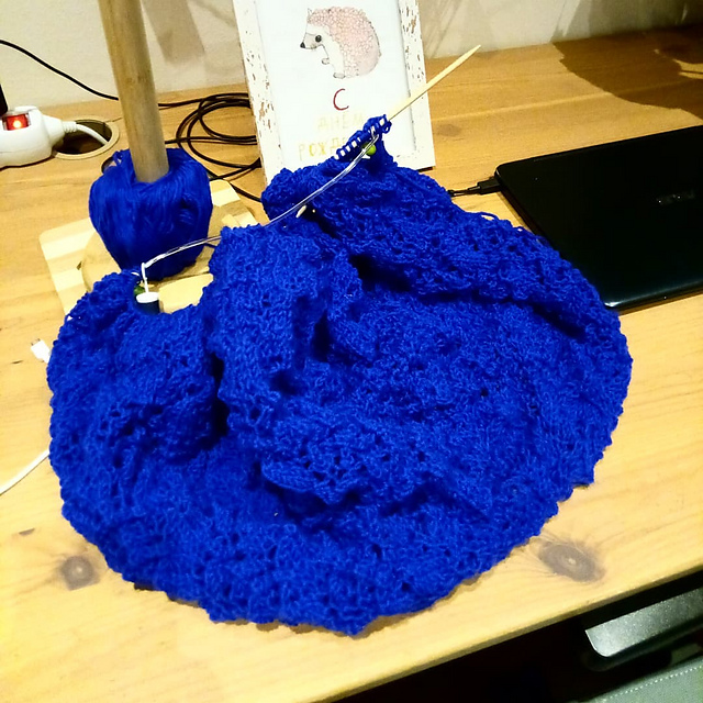 тут и зима настала :) еще одна вещь у меня начата, даже связала уже наполовину, но пришлось отложить из-за упомянутых мелочей. но мне уже очень хочется к ней вернуться!это тоже шаль, и тоже большая будет. Omelet by Joyce Fassbender, я её очень давно хотела, но непременно из шерсти, а шерсть долго не могла вязать из-за проблем с кожей рук. сейчас вроде т-т-т, получше. даже ультрафиолетовую лампу пока не доставала, как летом спрятала. но из шерсти ничего не вязала в этом году до, наверно, ноября. и хотела непременно синего цвета, и самого яркого оттенка (royal blue), я долго присматривалась, не хотела покупать по интернету именно из-за того, что цвет может оказаться не таким, и купила-таки в реальном магазине, в Маде, куда я бегаю за Джинсом или Макси (заодно купила и Джинс, и Макси :))))))