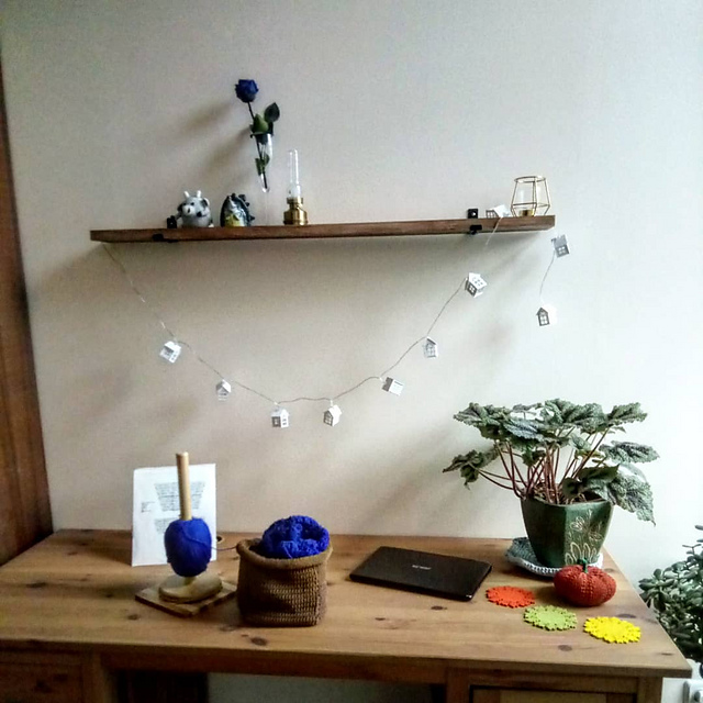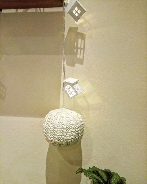 а тут у меня видите что? - обновка. Полочка над столом, на нее переехала большая часть барахла со стола :) а ещё обновка - гирлянда из домиков. ёж стал жертвой рекламы в инстаграме :))) но вообще я фанат домиков... знаете, да? сначала расстроилась - гирлянда горела очень слабо. но это было что-то не то с батарейками. теперь всё нормально :) как видите по фоткам с шарами...