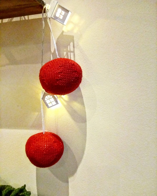 Тем не менее могу сказать, что описание отличное, связать такой шар легко. Главное, мой вам совет - вяжите потуже. Как можно более туго. Возьмите самые тоненькие спицы :)))) иначе придется помогать себе иголкой, так я исправила ситуацию, и результат получился вполне приемлемый. И набивайте тоже как можно туже, иначе шар не будет шаром :) Белый шарики связан по тому же принципу, но другим узором - мелкими косичками. На этот раз я была хитрее и к белой шерстяной нити прибавила Макси с люрексом. А спицы те же. Сразу плотнее стало, и шар побольше :) Вязала из Alize Cashmira, красных и белых, и белых Maxi metallic. Спицы 3.0