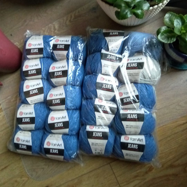 по клику ув.ёж сошёл с ума и на почве чёрной пятницы заказал себе ещё ниток! решил - Джинса много не бывает :) Главное, не под конкретный проект, а просто так. Потому что скидка, потому что красивый цвет. Темно-голубой (или светло-синий, как посмотреть) выкупила все мотки, сколько было, а ещё два других цветов взяла по одному на мелочи, типа вышеупомянутых мышек. Иногда надо ;)