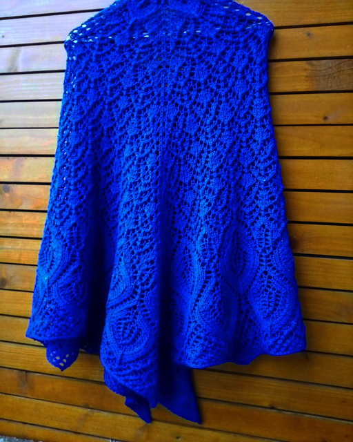 шаль большая, размах крыльев 190 cm. почти полукруглая, "позвоночник" не один, а три. очень давно хотела именно большую, шерстяную, и именно синюю. в поисках подходящего оттенка, наверное, год шерстила магазины. с опаской присматривалась к ниткам по интернету - неизвестно, каким цвет окажется на самом деле. и вдруг в "живом" магазине, который специализируется на турецких нитках, увидела очень красивый цвет, настоящий "Royal Blue", и нитки подходили по составу (100% шерсть) и по метражу. правда, сначала мне показалось, что хватит всего трех моточков (в описании сказано, что на шаль Omelet нужно 686 m, я и поверила).